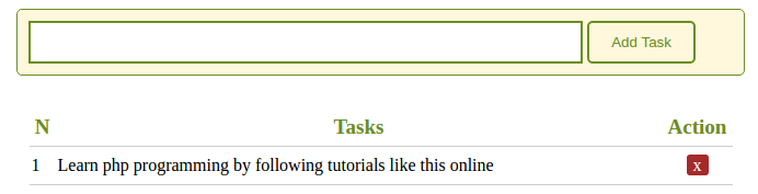 Una aplicación de lista de tareas simple que toma las tareas enviadas por el usuario en un formulario y las guarda en una base de datos MySQL. Las tareas también se recuperan de la base de datos y se muestran en la página web con un botón de eliminación al lado de cada tarea. Cuando se hace clic en el botón Eliminar, la tarea se elimina de la base de datos.
