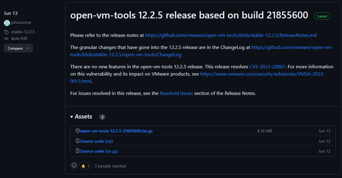 Los paquetes oficiales de herramientas abiertas de VM están aquí en el repositorio oficial de Github: Lanzamientos · vmware/open-vm-tools (github.com).