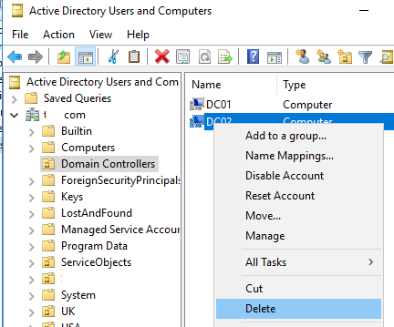 Para hacer esto, busque el controlador de dominio fallido en la consola ADUC y elimínelo como un objeto de computadora normal. Haga clic derecho sobre él, seleccione Borrary confirme la eliminación.