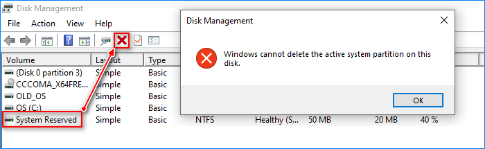 La partición reservada del sistema es un área crítica en el disco del sistema operativo y no se puede eliminar mientras se inicia Windows. La eliminación de la partición reservada del sistema solo es posible en discos del sistema operativo no activos.