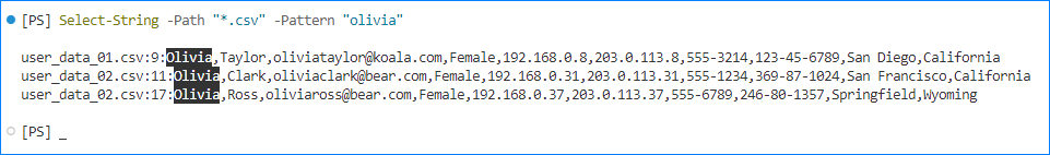 Select-String -Path "*.csv" -Pattern "olivia" -AllMatches