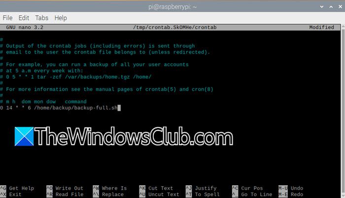 Antes de programarlo, ejecutemos chmod +x copia de seguridad-pi.sh. Para programarlo, escriba crontab-e, y luego agrega la línea 0 14 * * 6 /backupscript-ubicación/backup-full.sh.