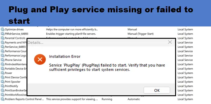 Si falta el servicio Plug and Play o no ha podido comenzar en Windows 11/10, puede seguir las soluciones mencionadas a continuación.