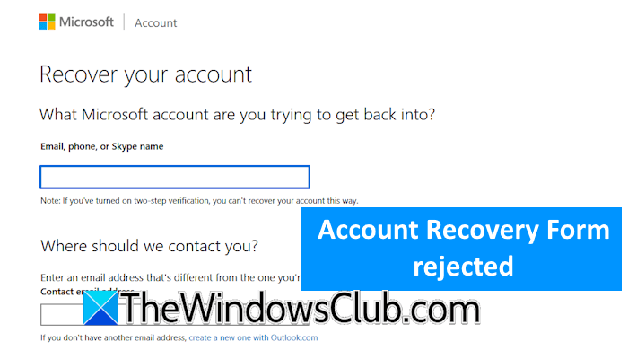 Formulario de recuperación de cuenta de Microsoft rechazado